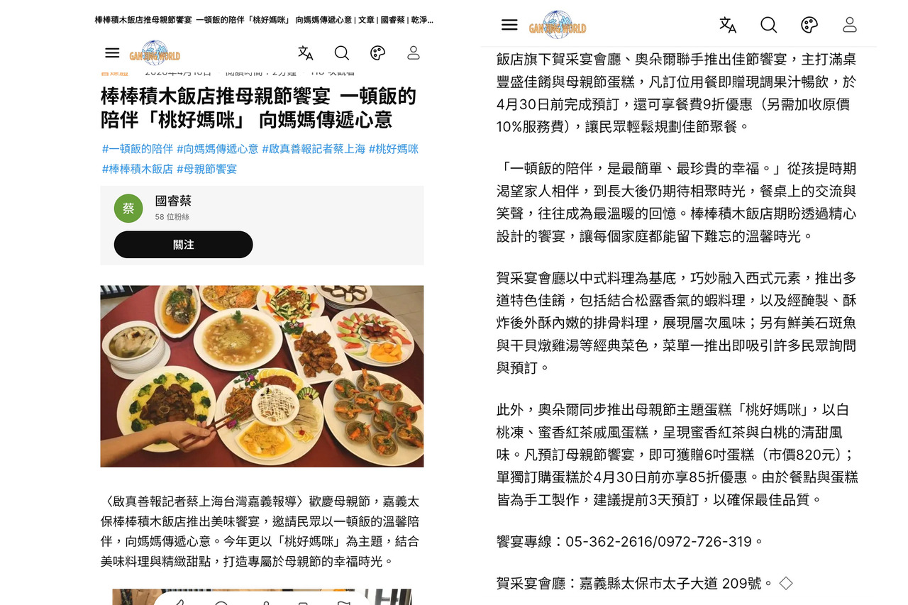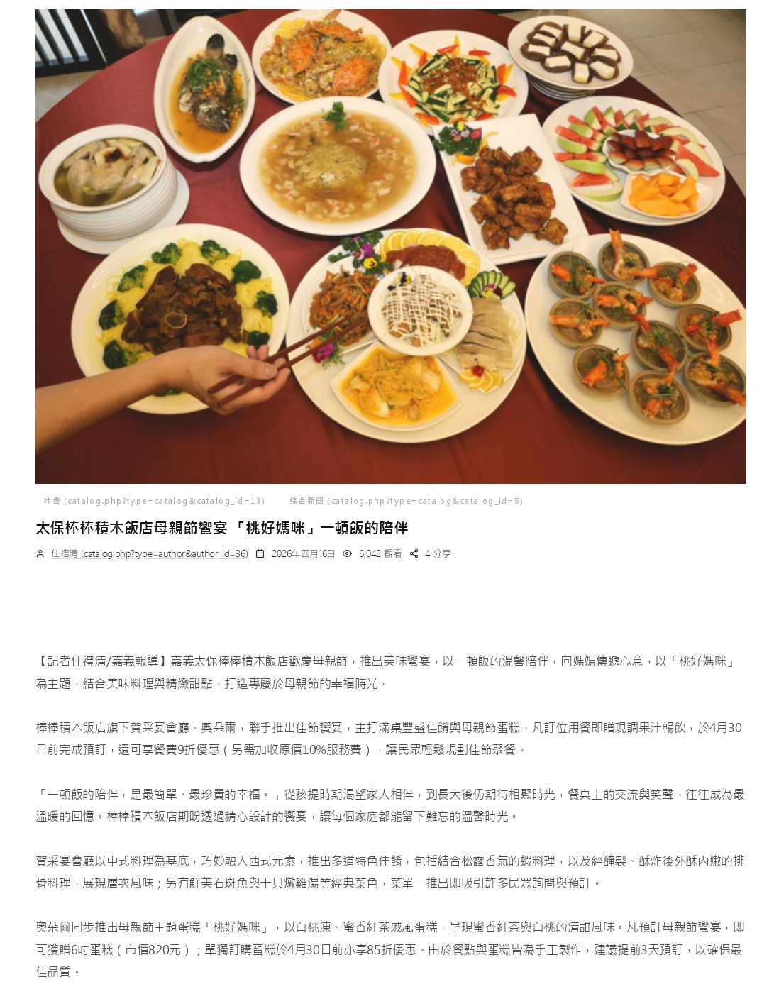 歡慶母親節,嘉義太保棒棒積木飯店推出美味饗宴,邀請民眾以一頓飯的溫馨陪伴,向媽媽傳遞心意。今年更以「桃好媽咪」為主題,結合美味料理與精緻甜點,打造專屬於母親節的幸福時光。