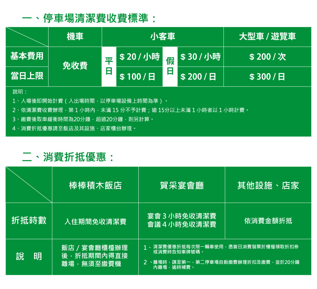 本飯店停車場為提升服務品質,顧客停車酌收清潔費,顧客消費時,請依據消費折抵優惠辦理折抵,若非在飯店及附屬設施消費者,將依據停車場清潔費收費標準收費。